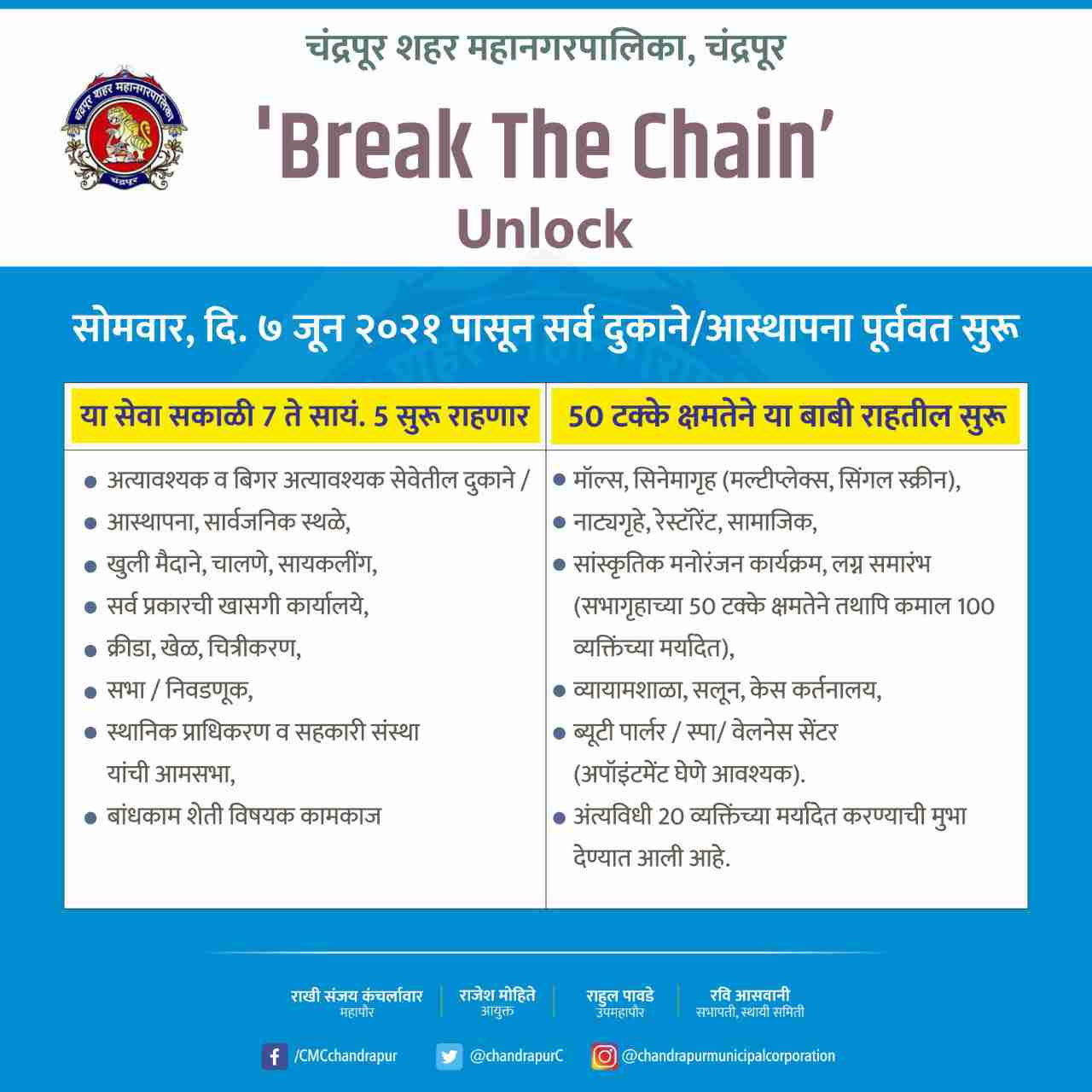चंद्रपुर शहर :- कोरोना के बढ़ते प्रभाव को रोकने के लिए चंद्रपुर महानगर पालिका की ओर से शहर के विभिन्न ठिकानों पर कोरोना टीकाकरण केंद्र शुरू किया है। कोरोना प्रतिबंध १८ से ४४ वर्ष की उम्र के ४ हजार ५३३ नागरिकों को पहला डोस फ्रंट लाइन वर्करों के साथ 45 वर्ष से ज्यादा उम्र के नागरिकों को पहला और दूसरा टीका दिया जा चुका है।