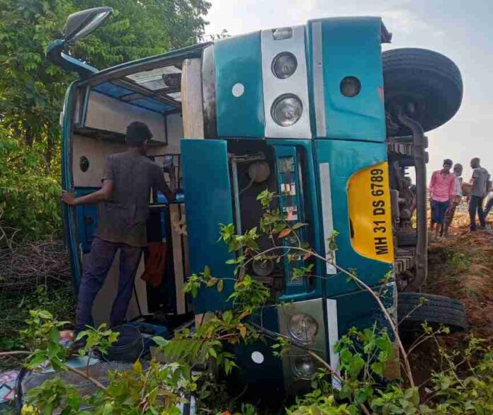 सविस्तर बातमी घुग्घुस :सिदेवाही तालुक्यातील पळसगाव(जाट)ते खातगाव भेंढाळा रस्त्याच्या फाट्यावरील राष्ट्रीय मार्ग असलेल्या रोडवर आज दुपारी साडेचार वाजता दरम्यान MH-31DS-6789 या क्रमांकाचे ट्रॅव्हल्स 23 प्रवासी घेऊन नागपुर वरून सिंदेवाही कडे येत असताना पलटी झाली त्यात 15 प्रवासी किरकोळ जखमी झाले असून त्यांना ग्रामीण रुग्णालय सिंदेवाही येथे दाखल करण्यात आले आहे सुदैवाने यात कोणतीही प्रकारची जीवित हानी झालेली नाही घटनास्थळी सिंदेवाही पोलीस दाखल झाले असून पुढील कारवाई सुरू आहे
