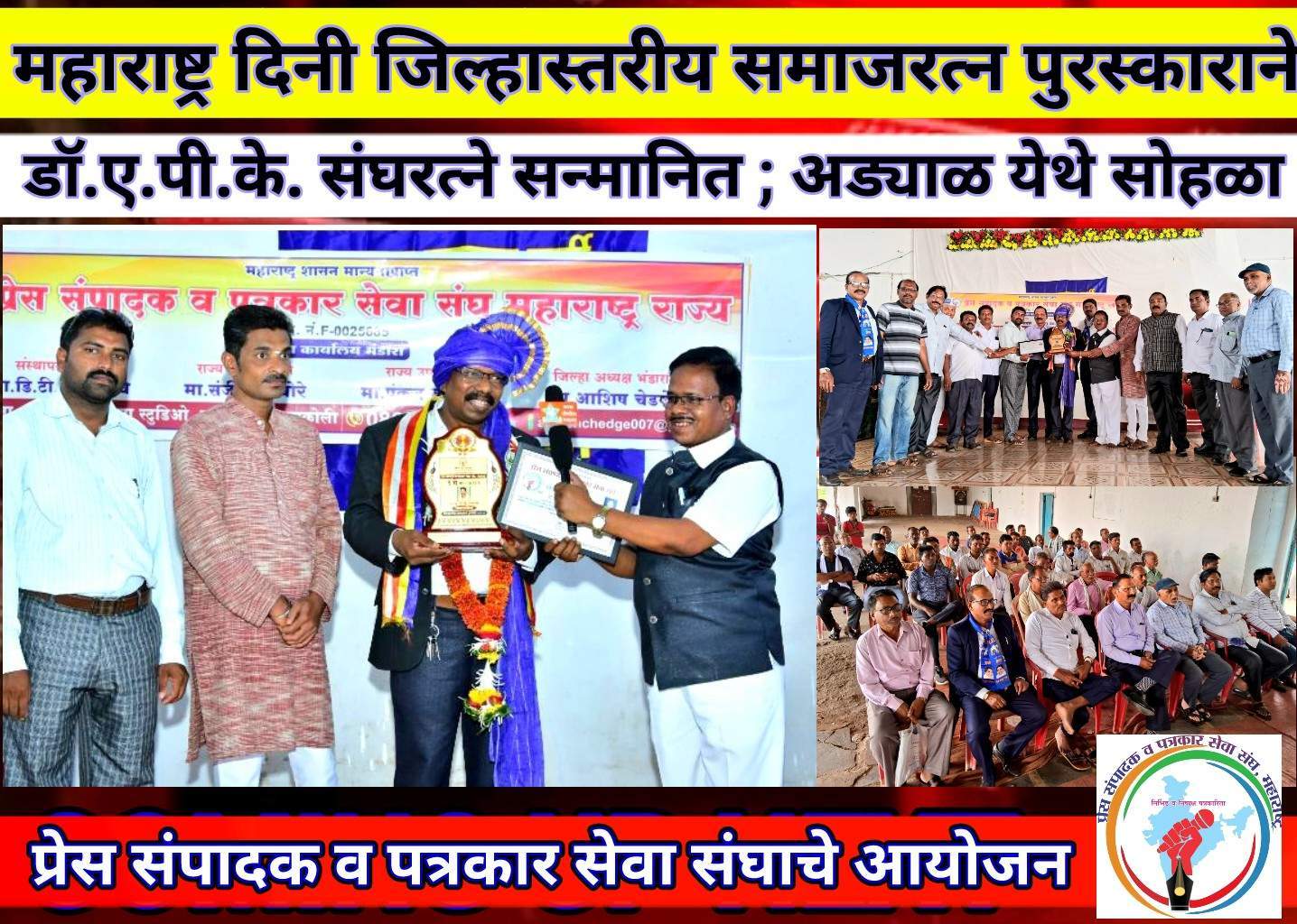 सविस्तर बातमी • साकोली : जिल्ह्यातील पवनी तालुक्यातील अड्याळ येथील सामाजिक कार्यकर्ते व व्यवसायाने डॉक्टर असलेले ए.पी.के .संघरत्ने यांचा आज १ मे २०२३ रोज सोमवारला महाराष्ट्र दिनी मुन्ना सभागृह अड्याळ येथे महाराष्ट्र शासन मान्यता प्राप्त प्रेस संपादक व पत्रकार सेवा संघटनेचे संस्थापक अध्यक्ष प्रा. डी. टी .आंबेगावे यांच्या मार्गदर्शनात प्रेस संपादक व पत्रकार सेवा संघटनेचे राज्य सरचिटणीस संजीव भांबोरे व राज्य उपाध्यक्ष पंकज वानखेडे यांच्या हस्ते वैद्यकीय क्षेत्रात कर्तव्यनिष्ठ राहून आपल्या जीवाची पर्वा न करता नागरिकांच्या सुरक्षितेसाठी अहोरात्र केलेल्या कार्याबद्दल मानाचा फेटा ,सन्मानचिन्ह, मानपत्र, पुष्पगुच्छ, देऊन जिल्हास्तरीय समाजरत्न पुरस्कार देत प्रेस संपादक व पत्रकार सेवा संघ महाराष्ट्र राज्याच्या वतीने गौरविण्यात आले.