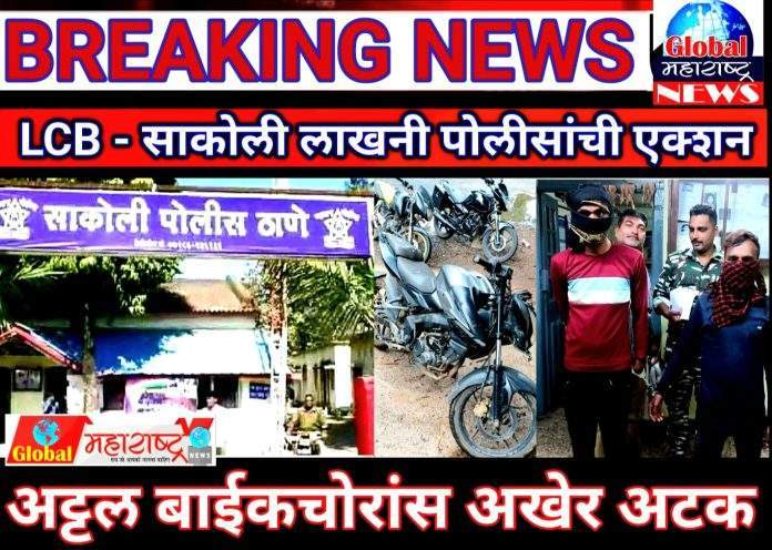 धम्मराज मेश्राम २४ रा. सेलोटी व चेतन मेश्राम २३ रा. मानेगाव सडक ता. लाखनी असे अटक केलेल्या आरोपींची नावे आहेत. स्थानिक गुन्हे शाखेचे पोलीस निरीक्षक नितीन चिंचोळकर, पो. हवा. प्रदीप डहारे, नितीन महाजन, किशोर मेश्राम, नंदकिशोर मारबते, विजय तायडे, रमेश बेदुरकर, मंगेश माळोदे, सचिन देशमुख, जगदीश श्रावणकर हे दि. १ मे रोजी पोलीस स्टेशन साकोली हद्दीत चोरीला गेलेल्या मोटारसायकलचा छडा लावण्यासाठी गस्त करीत असतांना मिळालेल्या गोपनीय माहितीद्वारे एका विनाक्रमांकाच्या मोटारसायकलने लाखनी परिसरात फिरत असल्याची माहिती मिळाली. पोलीस पथकाने आरोपी धम्मराज मेश्राम व चेतन मेश्राम यांना विनाक्रमांकाच्या मोटारसायकलसह ताब्यात घेतले. दोघांची विचारपूस केली असता साकोली पोलीस स्टेशन हद्दीत सहा व कारधा पोलीस स्टेशन हद्दीत एक मोटारसायकल चोरी केल्याचे कबुली दिली. साकोली व लाखनी पोलीसांनी त्यांच्या ताब्यातून चोरीला गेलेली मोटारसायकल क्र. एमएच ४९ बीए ५८४३, व क्र. एमएच ४९ एडब्ल्यू ६४९४ तसेच गंजलेले लोखंडी साहित्य असा जवळपास ९८ हजार ८०० रुपयांचा माल जप्त केला. स्थानिक गुन्हे शाखेच्या पथकाने दोन्ही आरोपींना पुढील कारवाईकरीता साकोली पोलीसांच्या ताब्यात दिले आहे.साकोली पोलीस स्टेशनचे पोलीस निरीक्षक राजेश थोरात हे दोन्ही आरोपींची कसून चौकशी करीत असून साकोलीत मागे झालेल्या घरफोड्यातही सदर आरोपींचा समावेश असल्याचे पोलिसांनी सांगितले. साकोली शहरातून संततधार पावसामुळे फायदा घेतला दोन दूचाकी चोरी गेल्यापासून साकोली पोलीस निरीक्षक राजेश थोरात व लाखनी पोलीस निरीक्षक मिलिंद तायडे यांची विशेष चमु दूचाकी चोरट्यांच्या मागावर होती आणि ३६ तासांतच स्थानिक गुन्हे शाखा पथकाच्या सहाय्याने साकोली व लाखनी पोलीसांनी एक्शन कारवाई करीत अट्टल बाईकचोरांस गजाआड करण्यात अखेर यश मिळविले आहे हे विशेष.