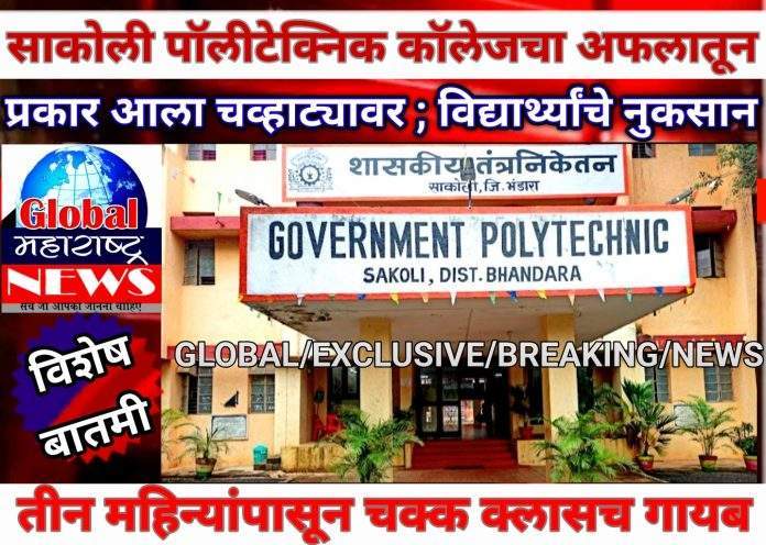 रिपोर्ट : आशिष चेडगे • उपसंपादक ग्लोबल महाराष्ट्र न्यूजसविस्तर बातमी – साकोली : शहरातील सेंदुरवाफा स्थित शासकीय तंत्रनिकेतन महाविद्यालयाची नुकतीच धक्कादायक बातमी समोर आली असून गत तीन महिन्यांपासून भाग २ व भाग ३ या सत्रातील संगणक विभागाचे वर्गच झाले नसल्याची धक्कादायक प्रकार समोर आला.