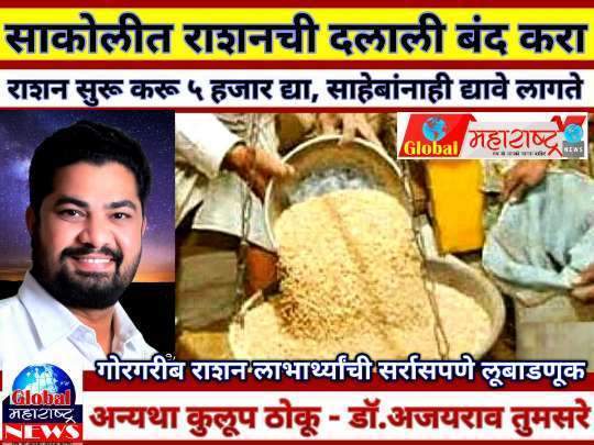 सविस्तर की, साकोली शहरी व ग्रामीण क्षेत्रातील मागील ३ वर्षांपासून तयार झालेल्या केसरी कार्ड धारकांना राशन मिळत नाही व नुकतेच १ वर्षाआधी नव्याने बनलेल्या कार्डांना राशन मिळत आहे. पण संतापजनक प्रकार हा की तीन वर्षांआधीच्या कार्ड धारकांना सांगितले जाते की राशन उपलब्ध करायचे असेल तर ५ हजार रुपये लागतील कारण साहेबांनाही द्यावे लागते असे काही दलाल दूकानदार गोरगरीब राशन लाभार्थ्यांची राशन देण्यासाठी अडवणूक करून राशनाचा लाभ देण्यासाठी नकार देतात. पाच हजार रुपये दिले तरच राशन सुरू करू अशी सर्रासपणे गोरगरीबांकडून लूटमारीचा व्यवसाय सुरू असून यात काही तहसील कार्यालय येथील समंधीत विभागाच्या कर्मचाऱ्यांचा हिस्सा असल्याचे राशन कार्ड धारकांत बोलले जात आहे. शासनाच्या सर्वांसाठी अन्न पुरवठा राशन योजनेला हे काही दलाल काही अवधीपुर्वीचे झालेल्या राशन कार्ड नावाखाली अशिक्षित गोरगरीबांना नविन ५ हजारांचा वसुली फंडा देत सर्रासपणे राशन लाभार्थी गोरगरीबांकडून अवैधरित्या वसुली करणाऱ्या दलाल व त्यात ५ हजारांच्या हिस्सेदारीतील कर्मचारी व काही दूकानदारांनी हा गोरगरीबांकडून संतापजनक लूटमारीचा व्यवसाय बंद करून शासकीय नियमानुसार तहसिलदार यांनी तातडीने चौकशी करून गोरगरीब सर्व जूने राशन कार्ड धारकांना व लाभार्थ्यांना राशन देण्यात यावे. अन्यथा समंधित विभागाच्या कर्मचाऱ्यांवर व काही दलाल दूकानदारांवर फौजदारी कारवाई करून अन्न पुरवठा विभागाला टाळे ठोकण्याचा इशारा कृषि उत्पन्न बाजार समिती संचालक डॉ. अजयराव तुमसरे यांनी दिला आहे. कारण काही दिवसांपासून हा गोरगरीबांना ५ हजारांची साहेबांना द्यावे लागते असा फंडा साकोली सेंदूरवाफा शहरातील चौकाचौकात गाजत होता हे उल्लेखनीय.