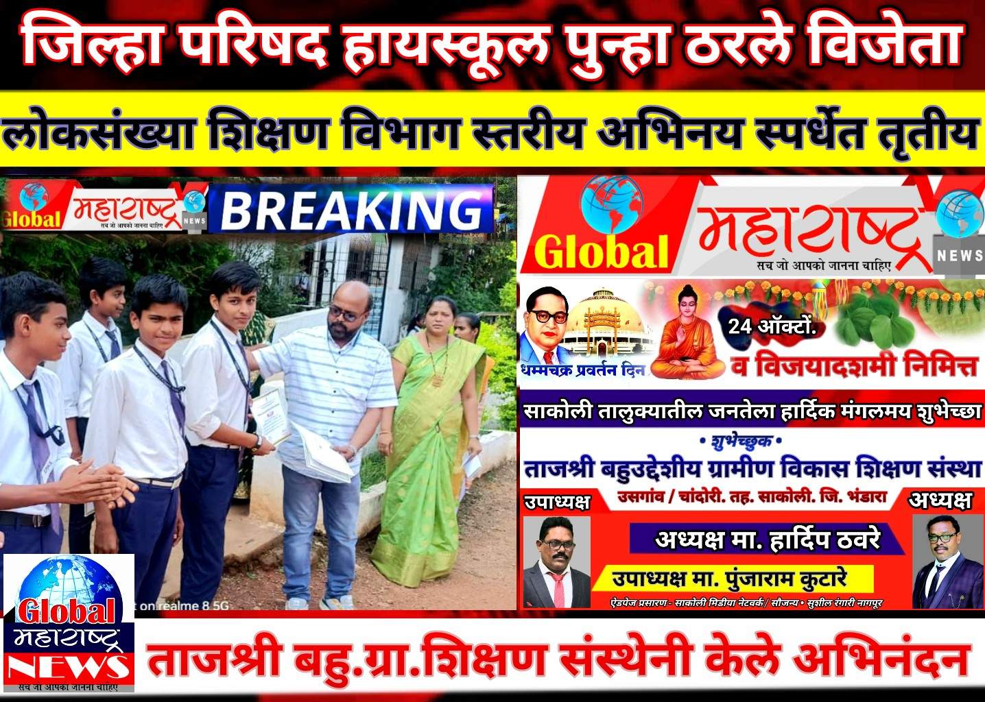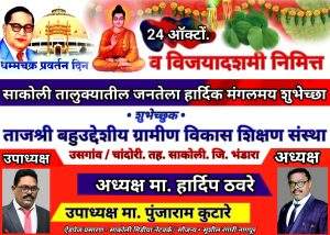 🔳 लोकसंख्या शिक्षण विषयक अंतर्गत व्यसनाचे दुष्परिणाम या विषयावर सहा मिनिटाचे सादरीकरण केले. विषयाची मांडणी उत्कृष्ट अभिनयासाठी शाळेचे विद्यार्थी रिद्देश देशमुख, आदित्य नंदेश्वर, दादाजी लांजेवार, सुशील कटरे व तनुज कठाने यांनी रोख पारितोषिक प्रशस्ती प्रमाणपत्र देऊन गौरव करण्यात आला. शाळेतर्फे मुख्याध्यापक धर्मेंद्र कोचे सहभागी विद्यार्थी शिक्षिका मार्गदर्शिका कु. प्रतिभा पडोळे तसेच अजय घरडे सर यांचे विशेष मार्गदर्शन व कौतुक करण्यात आले. याप्रसंगी शाळेचे शिक्षक बि.आर चव्हाण, कल्पना अतकरी, धनराज मसराम, मनोहर भैसारे, सय्यद, अजय डोये, सुबोध बोरकर, गिरीश सोनवणे, कु. लंजे, चाचेरे, चौधरी, इमरान तुरक, दिग्विजय चांदेवार व मनीषा खुणे याप्रसंगी उपस्थित होते. तर पुन्हा उपराजधानी नागपूरात साकोली जिल्हा परिषद हायस्कूलने यश संपादन केल्याबद्दल उसगांव/चांदोरी येथील ताजश्री बहुउद्देशीय ग्रामीण विकास शिक्षण संस्थेचे अध्यक्ष हार्दिप ठवरे, उपाध्यक्ष पुंजाराम कुटारे व संस्थेद्वारे या हायस्कूलचे अभिनंदन करून सर्व विद्यार्थ्यांना शिक्षकवृंदांना धम्मचक्र प्रवर्तन दिन व दसरानिमित्त हार्दिक शुभेच्छा देत मुलांचा गौरव केला आहे हे उल्लेखनीय.