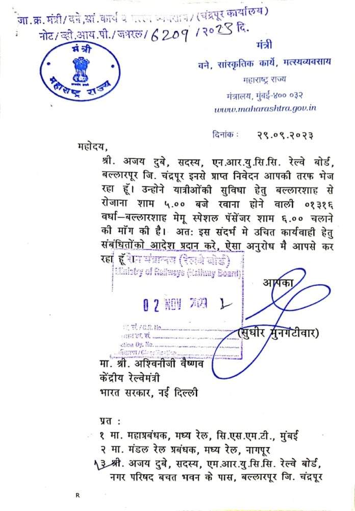 नौकरी पेशा,मरीजों एवं व्यवसायियों की सुविधार्थ बल्लारशाह वर्धा मेमू पैसेंजर को बल्लारशाह से शाम पांच की बजाय छह बजे रवाना करने की मांग को लेकर *राष्ट्रीय रेल उपभोक्ता सलाहकार परिषद NRUCC रेल मंत्रालय के सदस्य अजय दुबे* लगातार प्रयासरत थे.पहले ये ट्रेन बल्लारशाह से शाम पांच बजे छूट कर रात नौ बजे वर्धा पहुंचती थी.अब नई समय सारिणी अनुसार बल्लारशाह से 6.30 बजे निकल कर रात 9.30 बजे वर्धा पहुंचेगी. 27 सितंबर की बैठक में *डीआरएम नागपुर श्री तुषारकांत पांडे* ने उन्हें जल्द ही ये सुविधा उपलब्ध करवाने का आश्वासन भी दिया था.अंततः कल 2 नवंबर को मध्य रेलवे मुंबई मुख्यालय ने उक्ताशय का पत्र जारी कर दिया.श्री दुबे ने इस कार्य हेतु *पालकमंत्री श्री सुधीरभाऊ मुनगंटीवार,श्री राम करण यादव महाप्रबंधक मध्य रेलवे मुंबई,श्री तुषारकांत पांडेय DRM मध्य रेलवे नागपुर,श्री आशुतोष श्रीवास्तव सीनी. डी.सी.एम. नागपुर,श्री के. एस. पाटील सीनी. डी.ओ.एम. नागपुर* का विशेष रुप से आभार व्यक्त किया है.