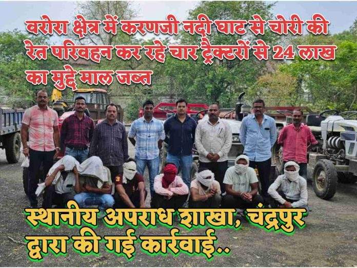 वरोरा क्षेत्र में करणजी नदी घाट से चोरी की रेत परिवहन कर रहे चार ट्रैक्टरों से 24 लाख का मुद्दे माल जब्त